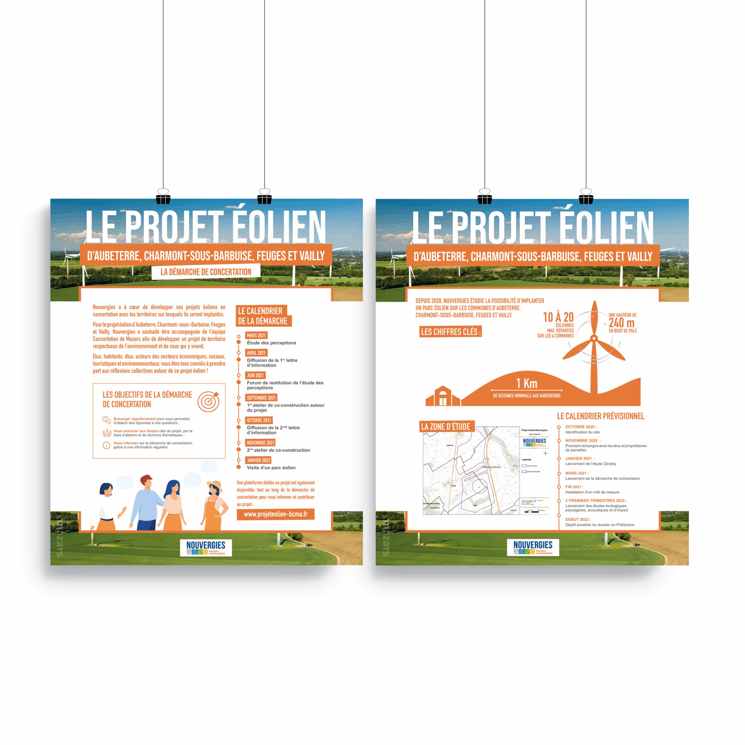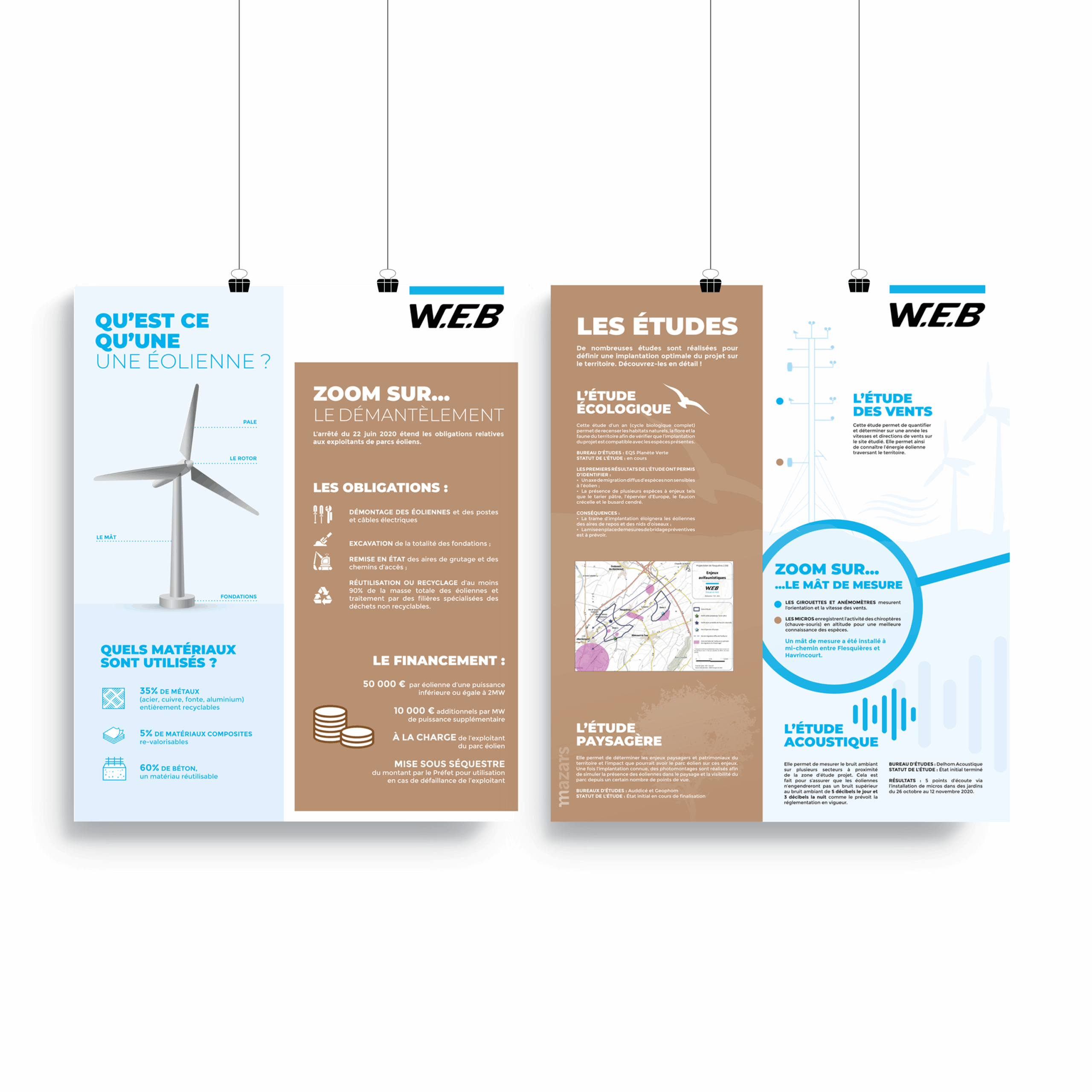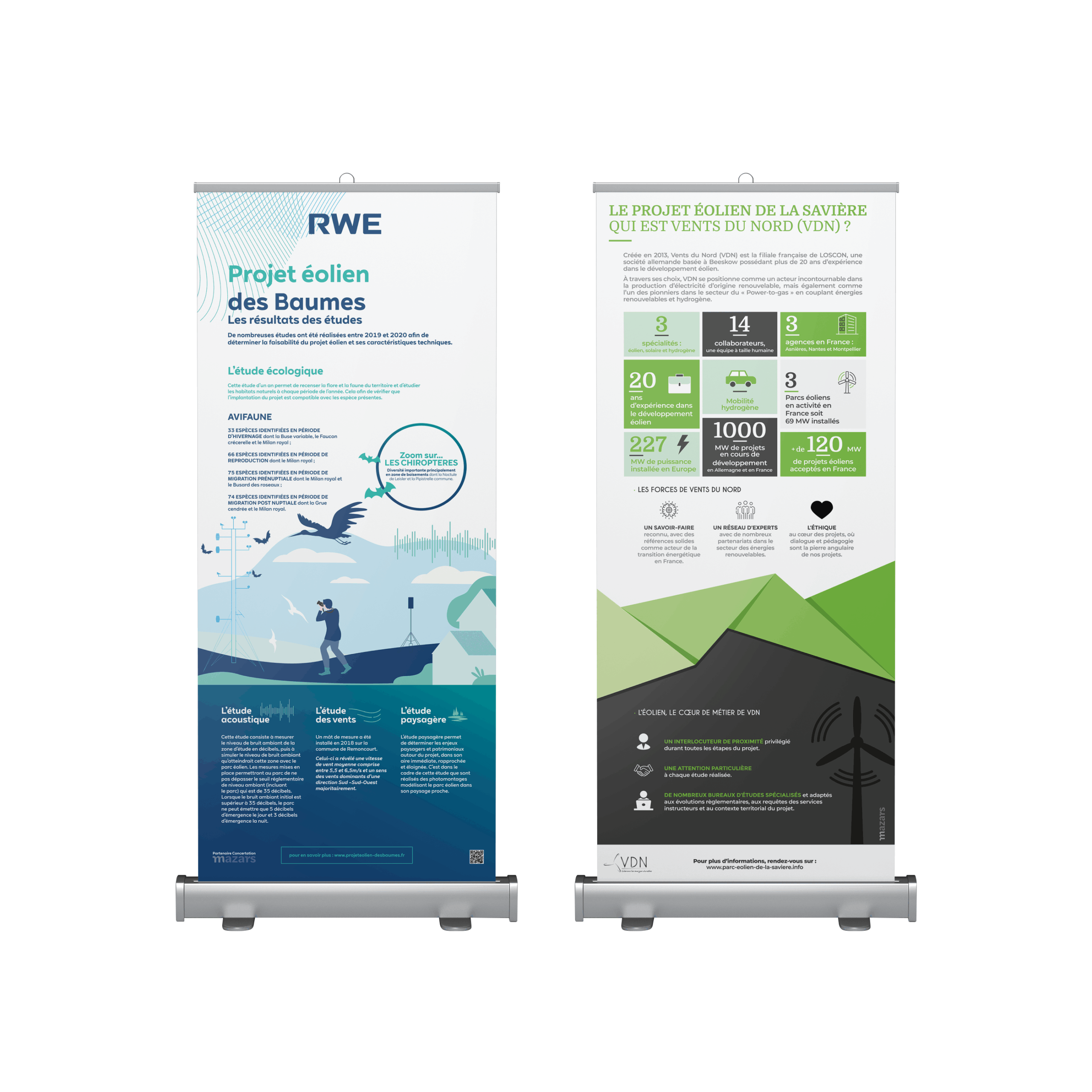 Ces kakémonos ont été réalisés pour informer et sensibiliser les riverains autour de projets de développement en énergies renouvelables. L’objectif était de proposer un support clair et pédagogique, accessible à tous, afin de vulgariser des notions techniques et d’installer un climat de confiance.